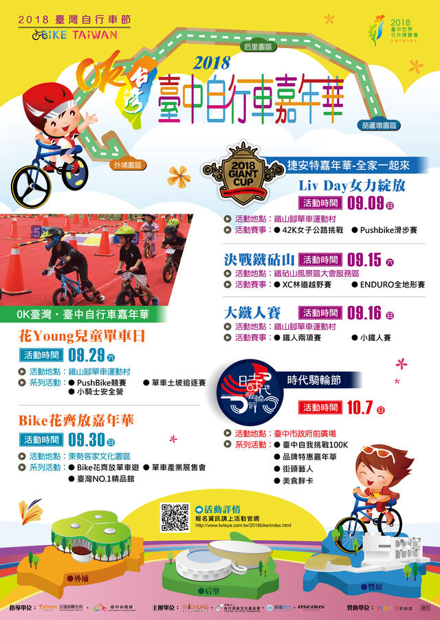 Taiwan is considered crucial to the global bicycle market, and Taichung is home to Taiwan’s prosperous bicycle industry and picturesque bikeways. 2018 OK Taiwan Taichung Cycling Festival is based in Dongfeng Bicycle Greenway and Houfeng Bikeway. The festival genuinely invites domestic and international visitors alike to embark on a low carbon cycling adventure in Taichung.