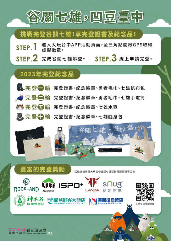 During the event period, participants who download the“Fun in Taichung App” and visit the Guguan Seven Heroes event task page can complete the GPS task for the Guguan Seven Heroes (Baxian Mountain, Malun Mountain, Wuwowei Mountain, Bojinjia Mountain, Dongmao Mountain, Baimao Mountain, Donmadang Mountain). By going to the triangle point (elevation) of each mountain, activating GPS location, and clicking on the virtual badge, participants can accumulate records of completing all seven mountains. They are then eligible to apply for a certificate and a souvenir for completing the Guguan Seven Heroes. (Completion certificates, completion badges, and souvenirs will be sent out gradually, with the last batch of applicants receiving them by February 29, 2024).