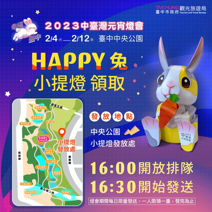 📍发放时间:灯会期间(2/4-2/12)每日下午4点开放排队、4点半开始发送,一人限领一盏,数量有限,发完为止喔。