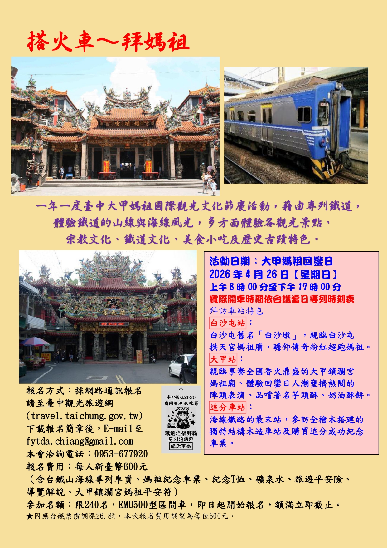 「2026台中妈祖国际观光文化节」结合一年一度台中大甲妈祖国际观光文化节庆活动,促进全国民众前来台中市观光旅游,藉由专列铁道,同时体验铁道的山线与海线风光,将台中境内观光景点结合整体行销,邀请民众报名参与,多方面体验各观光景点、宗教文化、铁道文化、美食小吃及历史古蹟特色。