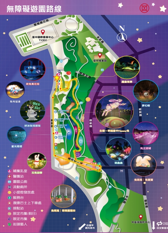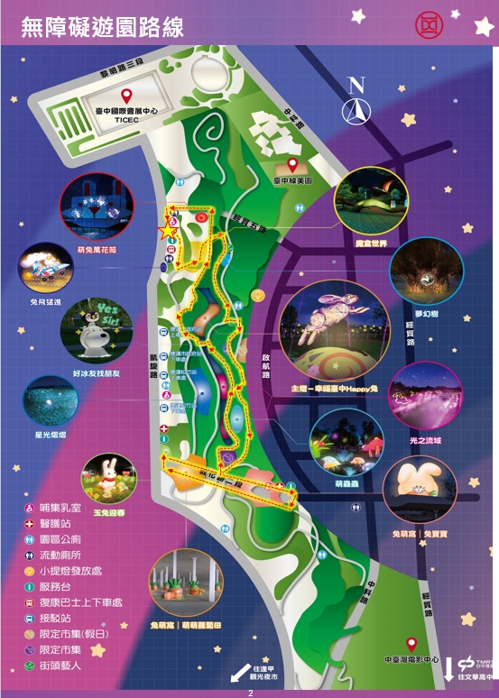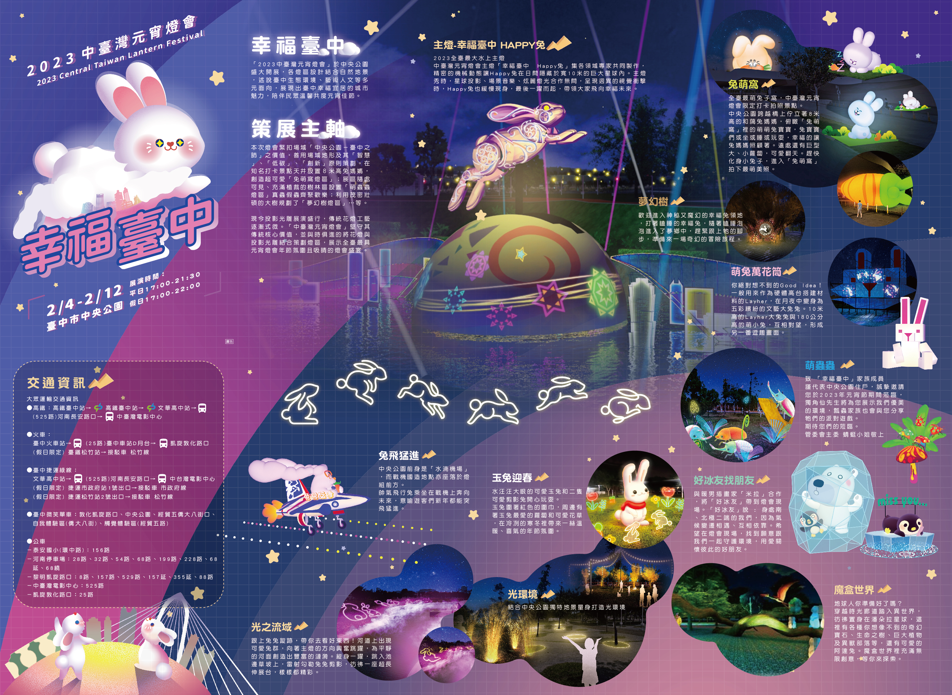 2023中台湾元宵灯会以「幸福台中」为主轴,布置7大主题灯区、逾30座灯组,以环境友善议题结合场域特色,打造出专属中央公园地形地貌的璀璨灯区;白天是大型装置艺术公园,夜晚则摇身变成耀眼花灯乐园,交织展现台中自然、人文之璀璨魅力,并兼具疫後城市重生、经济重振的意义,邀请全台民众体验台中舞彩绚丽的灯光飨宴,感受幸福宜居的城市魅力。