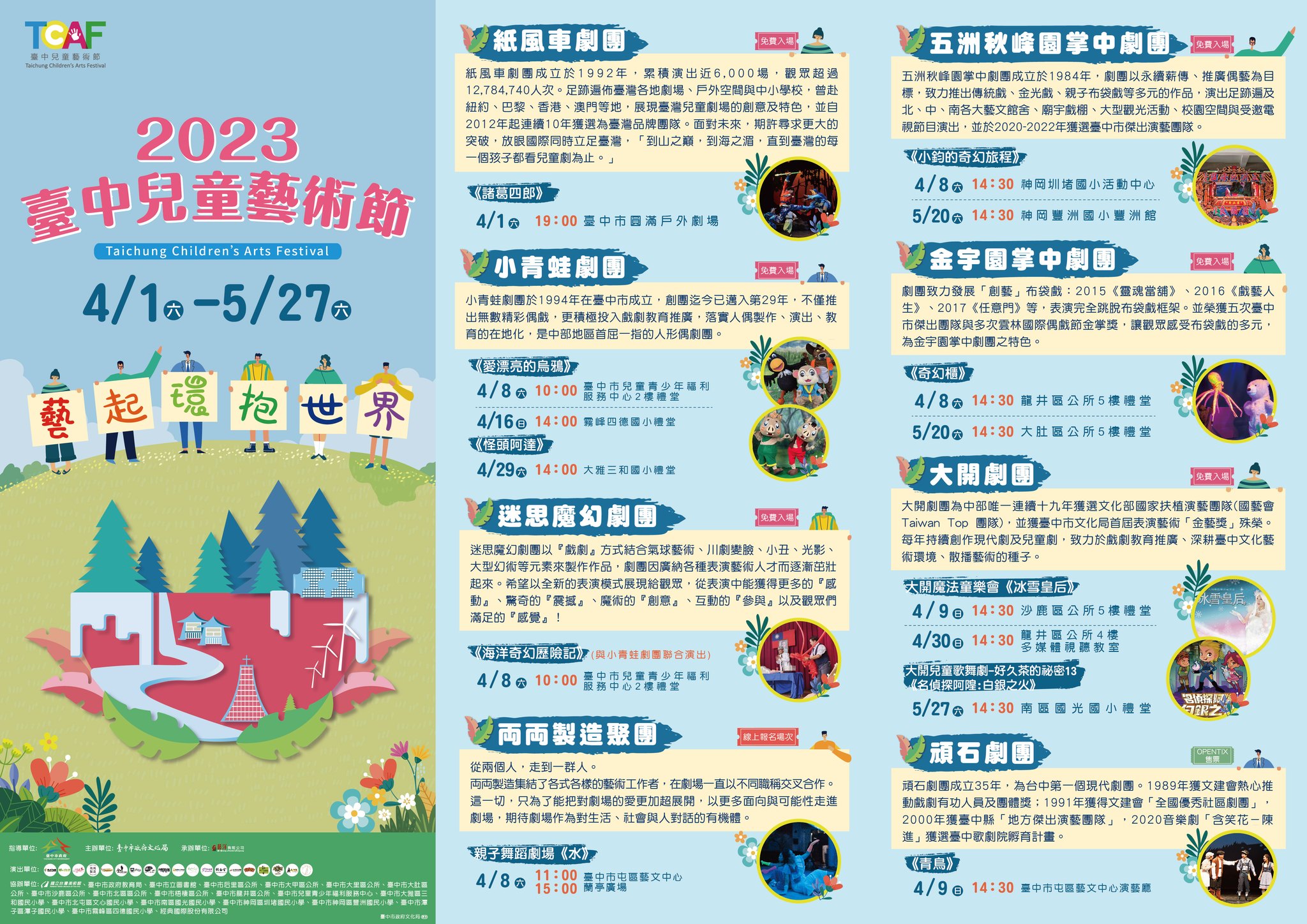 今年4、5月艺术节期间将由纸风车剧团、大开剧团、顽石剧团、极至体能舞蹈团、台中室内合唱团、妙璇舞蹈团、台中木偶剧团、小青蛙剧团、纯白舍Dance Lab、台湾青年管乐团、台中声五洲掌中剧团、五洲秋峰园掌中剧团、五洲园掌中剧团、金宇园掌中剧团、迷思魔幻剧团、共鸣室内乐团、大甲爱乐室内乐团等在地优秀演艺团队,在山、海、屯、城各区轮番带来适合亲子共赏的戏剧、音乐、舞蹈及偶戏等精彩演出。此外,今年特别邀请来自嘉义的杰出团队正明龙歌剧团演出歌仔戏、以及高雄的杰出团队両両制造聚团带来生动有趣的「宝宝剧场」,让大小朋友一起度过欢乐时光。