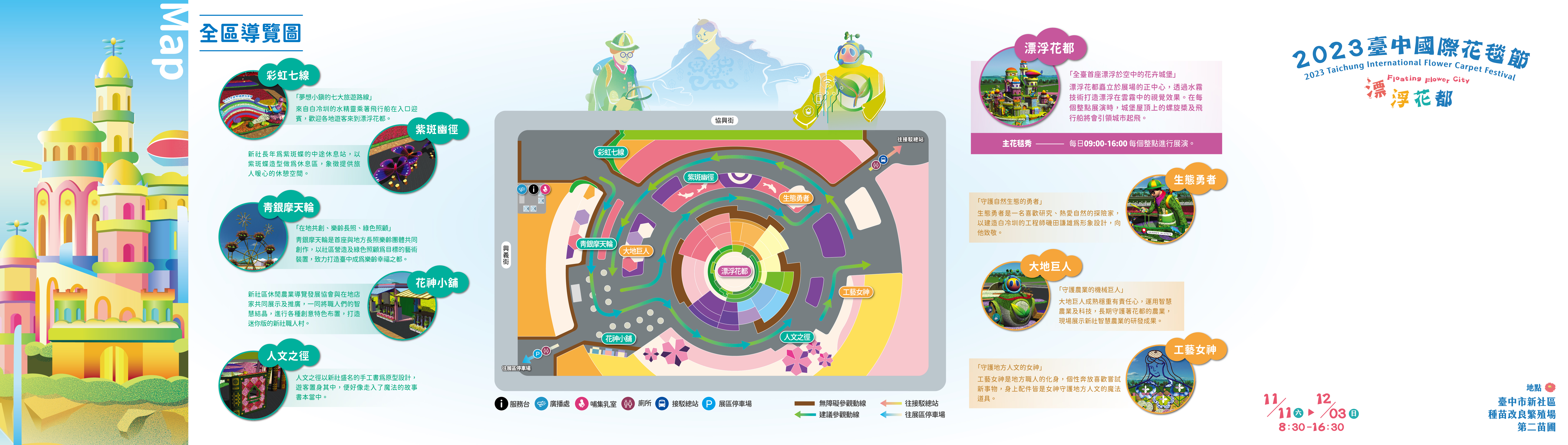 2023台中国际花毯节打造全台首座漂浮於空中的花卉城堡–漂浮花都,透过隐喻的方式将新社的自然生态、农业及人文等元素,设计为守护新社的三大守护神,一起将新社打造成生气盎然的模样,游客来到这里,彷佛走进一个充满理想的乌托邦。
