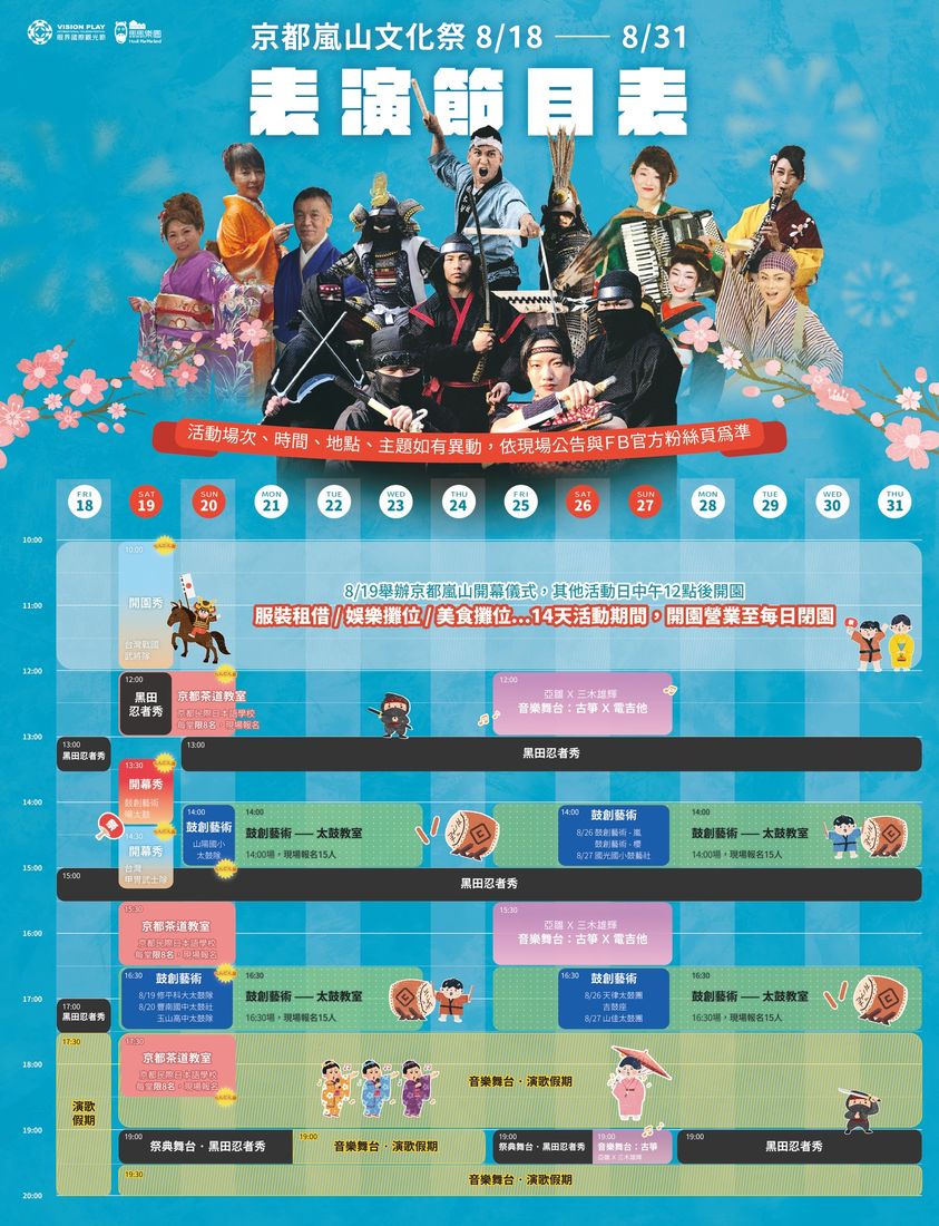 不用出国就可以体验日本京都岚山的风光与美食。8月18日至31日在台中后里马场举办京都岚山文化祭,特邀日本黑田忍者队、嵯峨商店街来台,让国人在台中也能玩出日本味,体验日本的民情文化氛围。