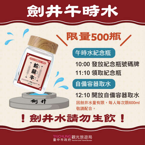 观旅局表示,今年活动以「蛇龙午 庆端午」为主题,取其谐音为「什麽都有」;也寓意着「蛇年到,心想事成、年年有余」。每年最抢手的限量午时水纪念瓶,也会在5月31日端午节当天上午10时开始发放号码牌,限量500份,发完为止,民众可免费领取。今年也再次邀请广受亲子喜爱的「陆爸爸说演故事剧场」演出,融合传统与创新的原创表演,带领大小朋友认识端午习俗与剑井取午时水的文化。除此之外,现场也有立蛋体验、立蛋比赛,以及多元的艺文表演,让民众感受浓厚的节庆气息。