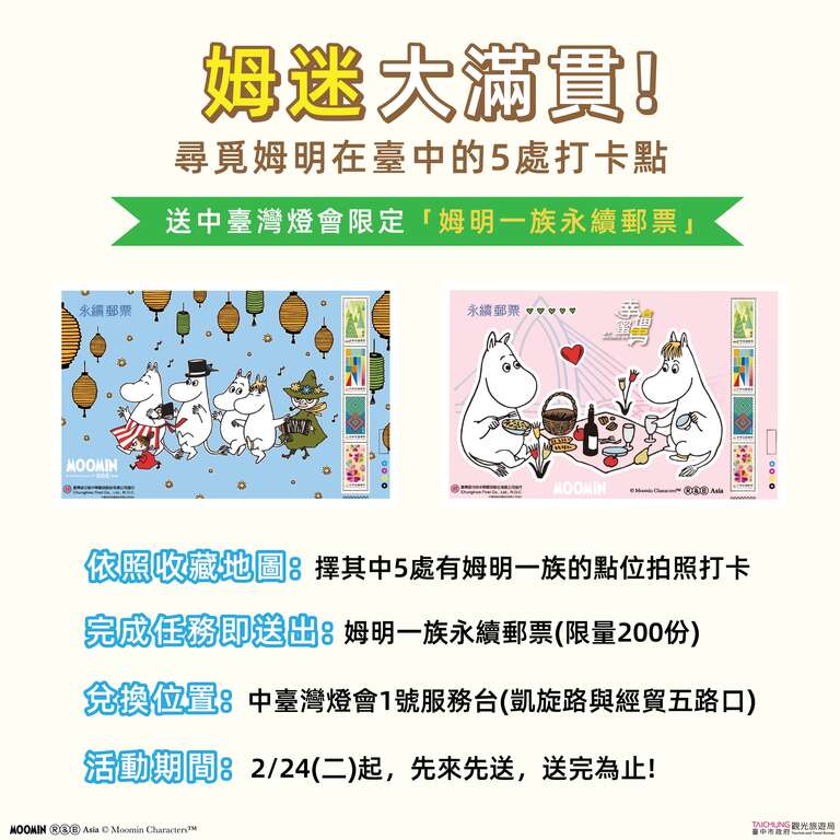 响应2026年WBC世界棒球经典赛即将开打,中台湾灯会正夯的北欧疗癒巨星「姆明一族」(The Moomins)也跨界加入应援阵容。为回馈亲自来到台中蒐集姆明幸福足迹的广大粉丝,台中市政府团队应景结合「棒球运动」精神,加码推出「姆迷大满贯」打卡活动,邀请各地民众找寻并集满5处姆明一族打卡点,前200位完成者,即可获得限量「姆明一族永续邮票」送完为止!
