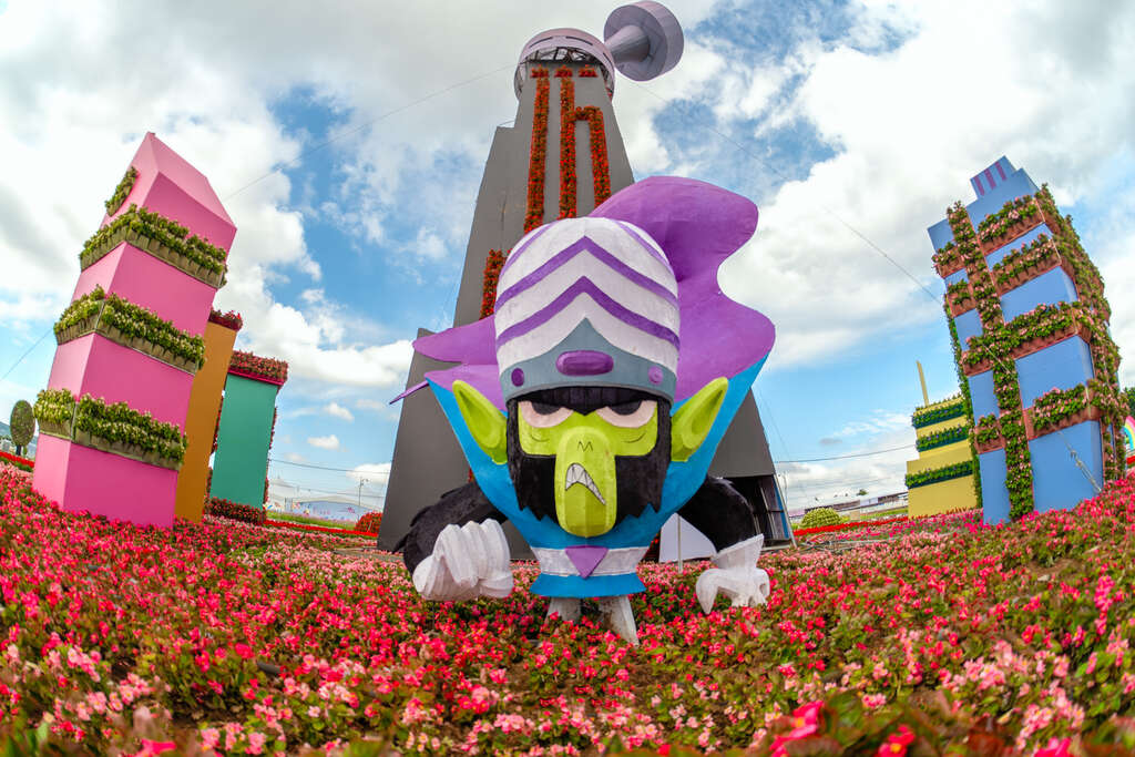 观旅局长陈美秀表示,今年新社花海花毯节以「动画元素 × 花卉艺术 × 永续共创」为策展核心,将备受喜爱的飞天小女警经典元素与在地花卉巧妙融合。现场共有15个装置及角色立牌,是历年最多。主花毯高18米、直径60米,最高处耸立魔人啾啾基地,每半小时自动展演泡泡、水雾与机械动态,成为游客争相拍照的焦点。园区更设置场景装置,如荡秋千与甜甜圈店,让大小朋友都能身历其境,亲自参与冒险。
