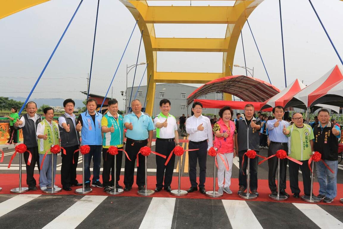 林市长指出,北峰桥全桥采钢拱圆弧造型,四线车道的设计,可以有效纾解尖峰时间交通壅塞,桥梁黄色显明的色彩,也成为地方新亮点。
