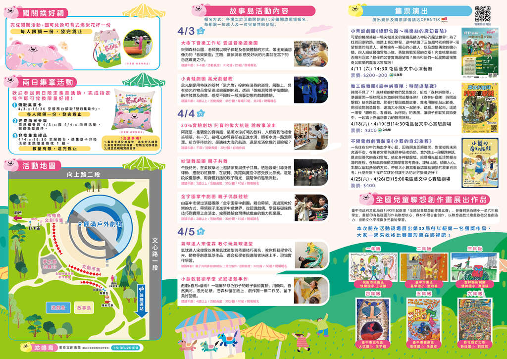 今年的儿艺节以「游乐园」为核心,贴心规划四大特色岛屿:在「梦之岛」与「故事岛」能饱览精彩的表演艺术;想挥洒汗水、大玩特玩的孩子,绝不能错过「游戏岛」的丰富互动体验;而「咕噜岛」文创市集,则是挖宝创意小物与享受美食的绝佳去处。