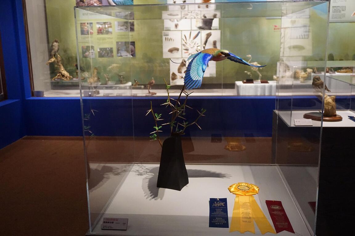 展场入口意象是二水国中师生小环颈鴴作品,生动的水鸟群作品是在学校课程中完成的,师资包括本次特展的野鸟木雕家李宜融与黄麟鸣,让孩子有机会打开眼界、乐於学习。展场有一李宜融老师的作品「紫胸佛法僧」,曾在美国、日本等地的竞赛得奖,鲜艳的呈现引人注目。另外,日本野鸟雕刻协会的14件作品飘洋过海到台湾,仅展出3天(至7月16日)。