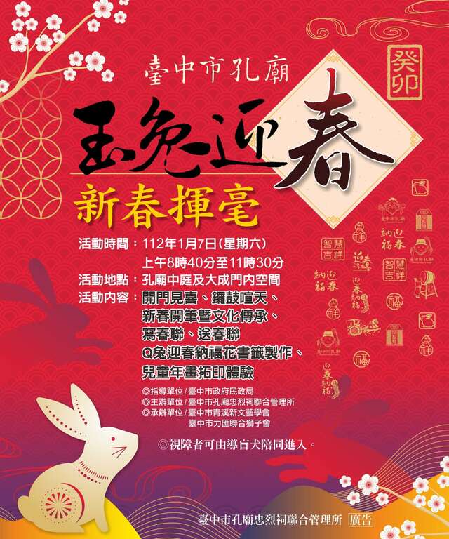 农历春节将至,挥别虎年迎接兔年到来,台中孔庙结合台中市青溪新文艺学会及台中市力汇联合狮子会,将於1月7日上午8时40分举办癸卯年「玉兔迎春,新春挥毫」活动,邀请书法界多位名家现场挥毫,让民众免费索取年字年画,增添年节福气。台中孔庙表示,现场将准备600份春联免费赠送,活动当日前200名入园民众还可兑换「开运吉祥如意红包吊饰」乙份,欢迎民众踊跃参与。