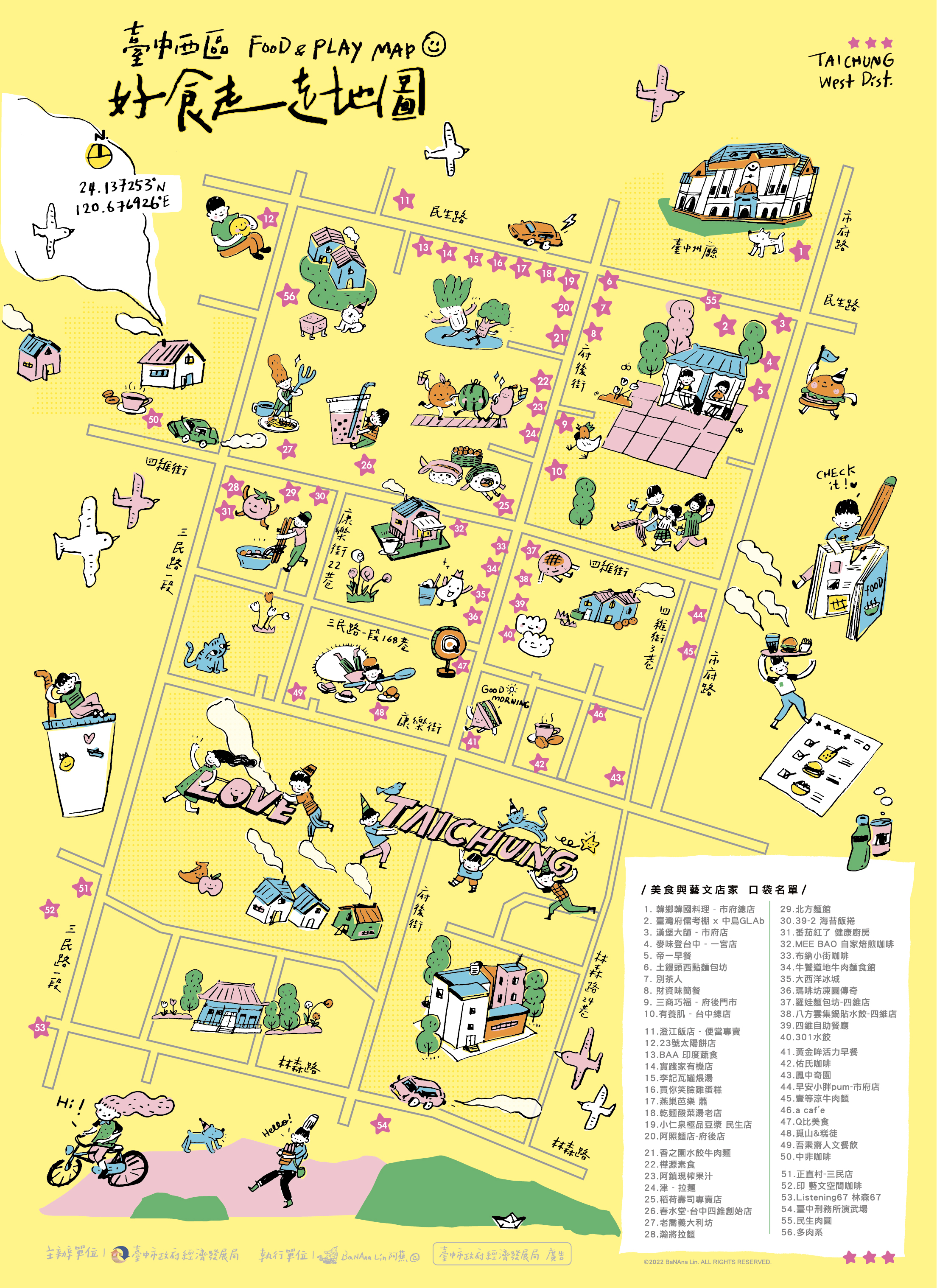 经发局指出,这次与知名创作家「阿蕉」合作,整合西区特色美食店家,用生动插画方式取代传统冗长的店家介绍资讯,并将每个店家用简单可爱的图案标示在地图上,趣味又清楚明了的设计希望引起民众共鸣,欢迎各地游客到西区体验艺文美食魅力之旅。