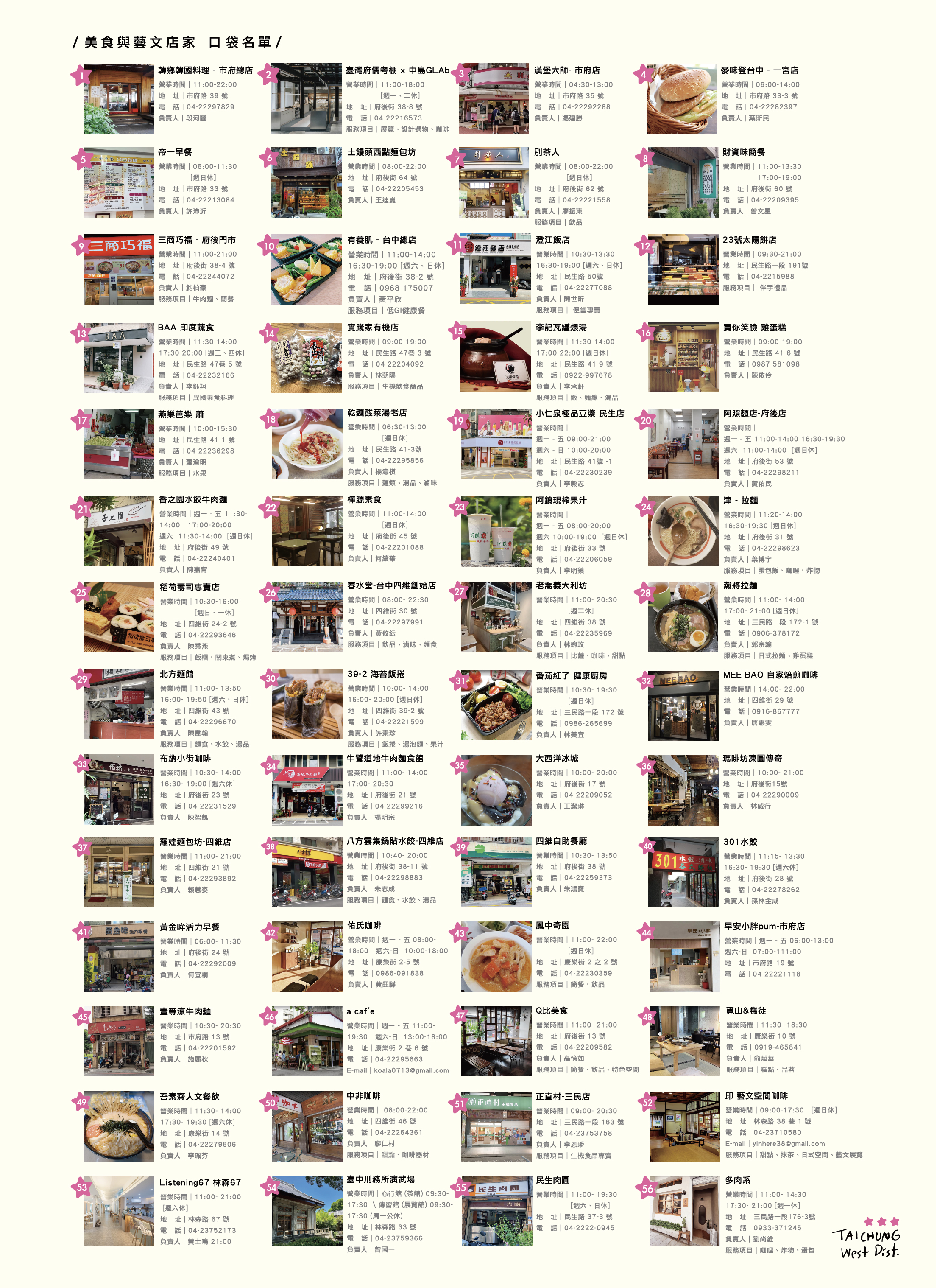 经发局长张峯源表示,西区拥有百年历史及丰富的人文资源,有「台中市文教区」的美称,像是台中州厅、台湾府儒考棚及刑务所演武场等,文化设施众多,可说是来台中旅游必踩景点,而必吃美食包含许多老台中人的口袋名单。在当地市议员张彦彤及利民里里长陈敏祥的建议及协助下,经发局推出「台中西区好食走一走」地图,让游客一手掌握西区美食资讯,也唤起老台中人记忆中的好味道。
