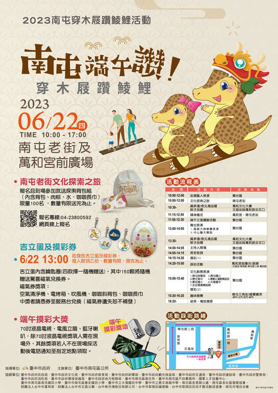 南屯区长林秋万说明,今年穿木屐躜鲮鲤活动从上午10时延续到下午5时,万和宫广场前舞台区规划一系列精彩表演,下午2点半众人踩街、手持响板绕行南屯老街欢庆端午,还有多项趣味游戏及穿木屐竞走活动;另参加踩街民众,下午1时起可排队领取限量「吉立蛋」,内含南屯吉祥物咖咖造型钥匙圈1个及摸彩券1张,当天将抽出70寸液晶电视、电风立扇及蓝牙喇叭等奖项幸运得主。此外,好礼加码惊喜送,其中150颗吉立蛋随机赠送惊喜福气兑换券,幸运儿将有机会获得空气清净机等丰富好礼,邀请大家相约到台中南屯体验有别以往的端午节。