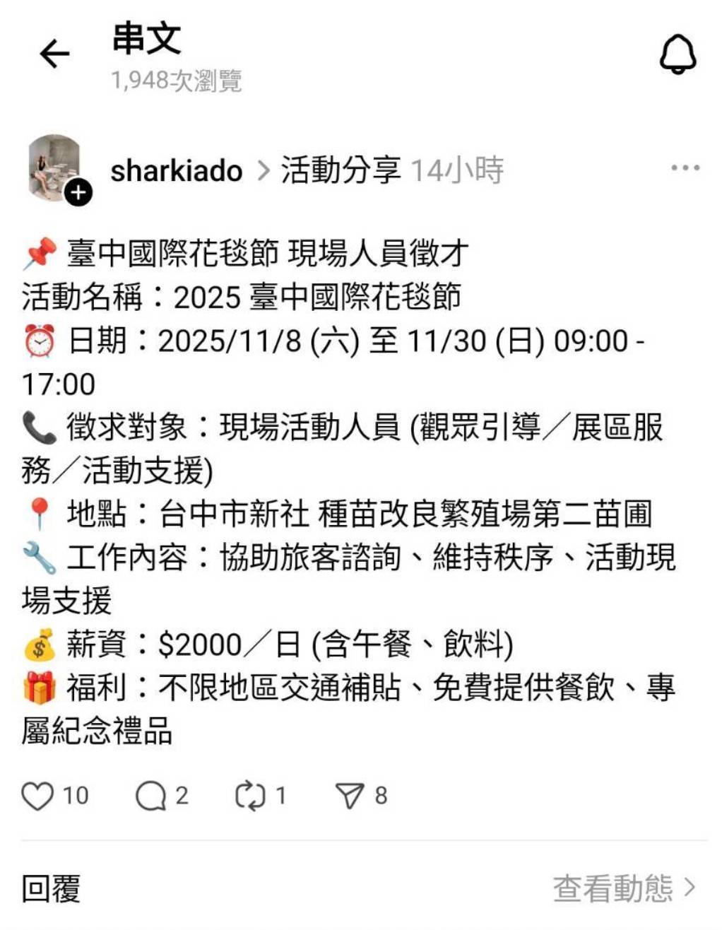 (一) 在地招募,从未网路公开徵才:台中国际花毯节为强化永续在地精神,活动工作人员多与新社在地夥伴、学生及志工团体合作,从未透过任何网路平台公开招募「现场人员」或「工读生」。任何声称提供花毯节相关工作机会的贴文,皆为诈骗。