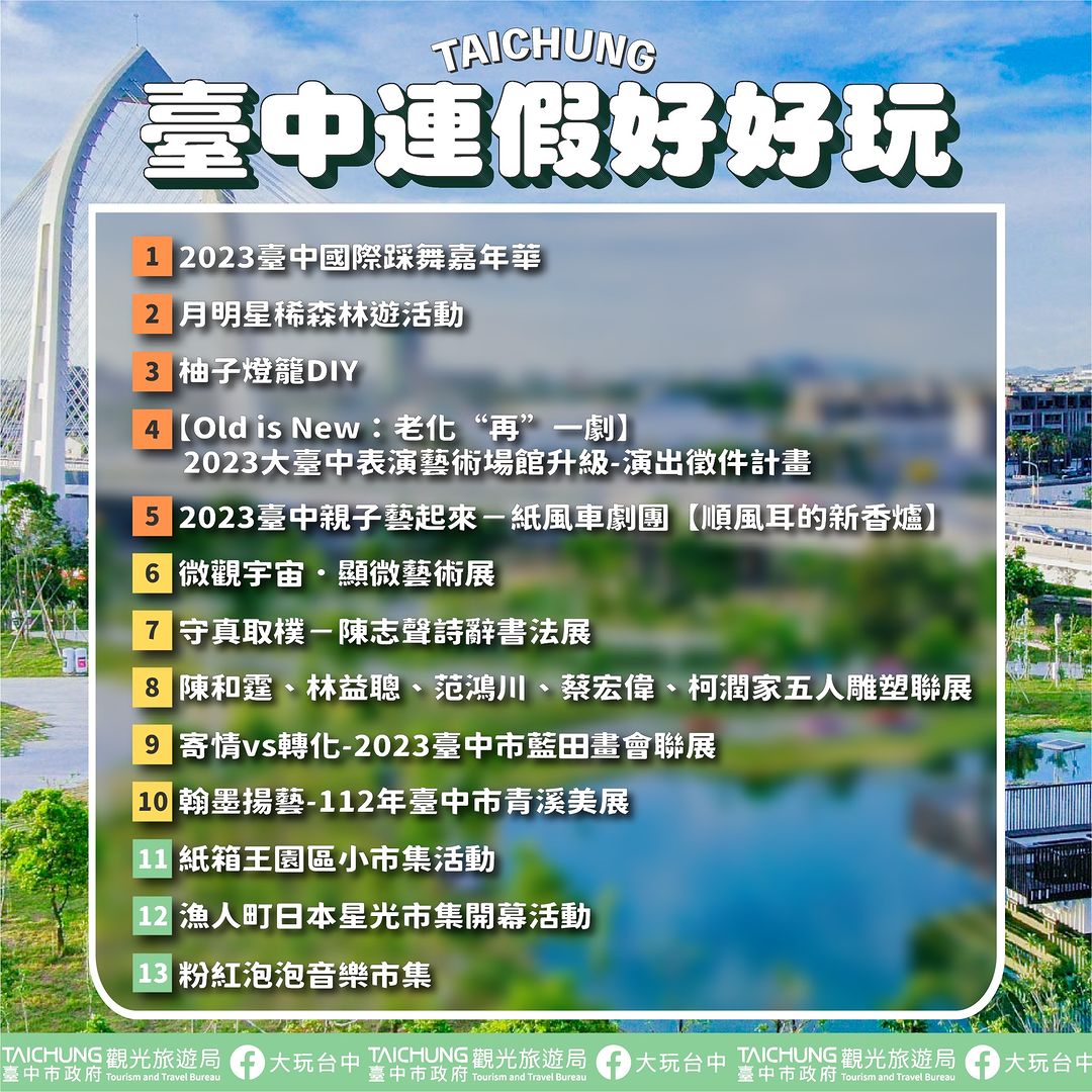 이번 주말에는 어디에 놀러 가시나요? 주말에 타이중에서 풍부하고 재미있는 활동을 즐기며 타이중의 새로운 매력에 빠져보세요.