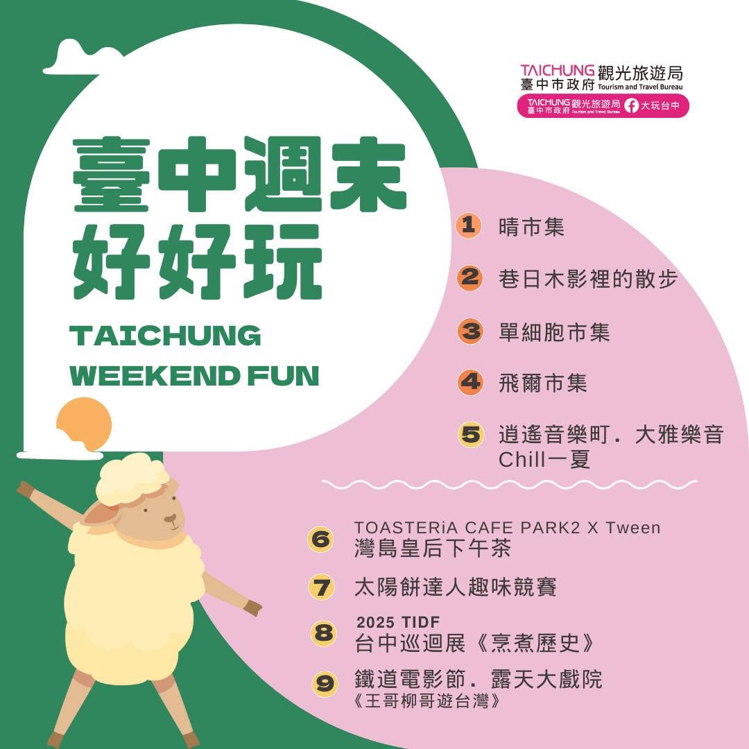 - \𝑻𝒂𝒊𝒄𝒉𝒖𝒏𝒈 𝑾𝒆𝒆𝒌𝒆𝒏𝒅 𝑭𝒖𝒏!/這週末,從花毯節的繽紛早晨 一路玩到草地音樂會的浪漫夜晚 讓整座台中都變成你專屬的秋日舞台 市集|忠信市集 11/8(六)-11/9(日) 10:30–19:00 台中市西區忠信市場內 (台中市西區五權西路一段67號) 活動連結:https://reurl.cc/lYEM36 -------------------------------- 市集|汪派出任務・臘腸聯萌公益市集 11/8(六)-11/9(日) 13:00–19:00 帝國製糖廠台中營業所 (台中市東區樂業路30號) 活動連結:https://reurl.cc/GpNlrD -------------------------------- 市集|角落的時尚駐點Style Notes 11/8(六)-11/9(日) 11:00-20:00 金典綠園道 (台中市西區健行路1049號) 活動連結:https://reurl.cc/rYzXxy -------------------------------- 市集|塔可市集 11/8(六) 15:00-21:30、11/9(日) 14:00-20:30 PARK2草悟廣場 (台中市西區英才路534號) 活動連結:https://reurl.cc/2lg2NX -------------------------------- 活動|2025臺中國際花毯節 11/8(六)-11/30(日) 8:30-16:30 新社區種苗改良繁殖場第二苗圃 活動連結:https://reurl.cc/mYWX9A -------------------------------- 活動|阿罩霧草地音樂會 11/8(六)-11/9(日) 15:00-20:00 立法院民主草坪 (台中市霧峰區中正路734號) 活動連結:https://reurl.cc/ko4k8n -------------------------------- 活動|草悟道快閃體驗 11/8(六) 14:00–16:00 PARK2草悟廣場 (台中市西區英才路534號) 活動連結:https://reurl.cc/Eb2yaA -------------------------------- 活動|臺中市社區文化季《社造大富翁》 11/8(六) 10:00-15:00 文心森林公園南側溜冰場(台中市南屯區文心路一段與大墩七街交叉口) 活動連結:https://reurl.cc/Qa1m25 -------------------------------- 活動|台中寵物展 11/7(五)-11/10(一) 10:00-18:00 台中國際展覽館 (台中市烏日區中山路三段1號) 活動連結:https://reurl.cc/7bognQ --------------------------------2025-11-07