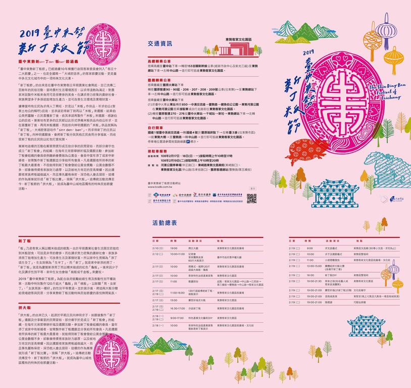 活動月份:2019-02-17~2019-02-19 加入Google行事曆 「新丁粄節」是東勢客庄流傳百年的民俗活動,起源於過去是勞力密集的農業社會,家族總希望多子多孫多福氣,於是為求得子女以「米粄」供品祈求上天,並許願將會以更多「米粄」還願,結果靈驗。因此漸漸將因求得子女(即新丁)而向神明還願的「米粄」供品稱為「新丁粄」。 活動內容 活動網址:https://www.tcsdb.com.tw/index.php 相關照片