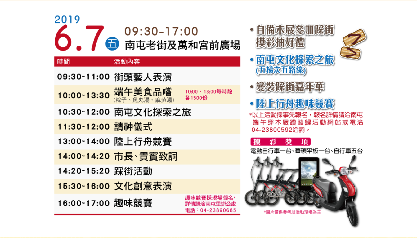 活動當天自備木屐參加踩街活動可獲得限量小木屐吊飾及參加摸彩,有機會將電動自行車、平板電腦等好禮帶回家,現場還有免費肉粽、麻芛湯等端午美食供民眾品嚐。