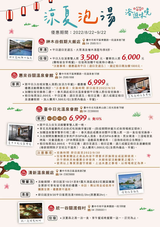 說明| 在溫泉季活動期間,聯合臺中溫泉旅宿業加碼推出涼夏泡湯優惠方案,優惠詳細內容請逕洽各家業者訂房詢問,依其公告為主。