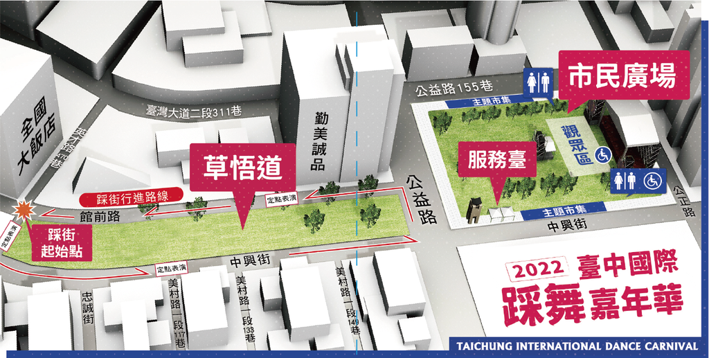 - 在「市民廣場」打卡,並標註 #2022臺中國際踩舞嘉年華,到服務臺兌換限量紀念品