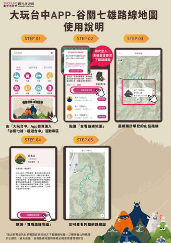 - 登山前請務必先行下載並學習使用離線地圖,以確保登山時路徑的正確性,避免迷途,大玩台中APP內建谷關七雄及步道任務路線地圖,可多加利用,查看路線地圖時請務必確保周遭環境安全,避免邊走邊看。