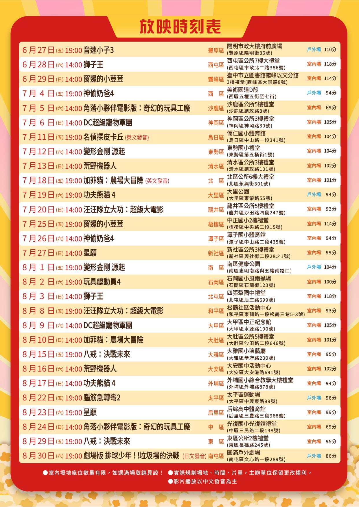 不但於7月4日西區、7月19日大里區、8月1日南區、8月22日太平區等戶外場次提供免費視障按摩體驗外,更在7月4日西區及8月1日南區場次分別邀請向日光視障樂團及飛行者樂團於現場表演,讓市民在看電影時也能傳遞友善與溫暖。