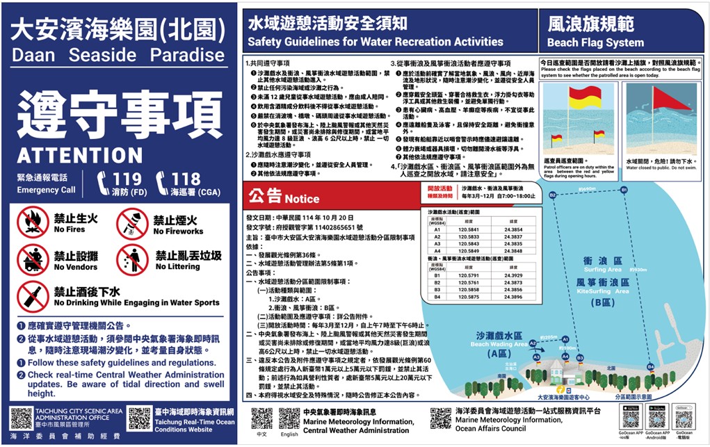觀旅局長陳美秀指出,市府配合行政院「向海致敬」政策,持續推動民眾「知海、近海、進海」,並於去(114)年10月20日公告大安濱海樂園海域轉型為「開放式水域」,透過制度完善與安全配套,讓親海活動更加自由也更有保障。為讓民眾安心親海、放心戲水,市府建置「台中海域即時海象」資訊系統,提供民眾更即時的海象資訊以評估因應戲水安全。