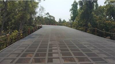 建設局指出,因整體園區規劃樹林現地保留,空中步道引橋避開樹木彎曲施作。橋面以半簍空鍍鋅鋼網,可看到橋面下方綠樹,若遇樹木難以避開,橋面則以開口方式繞開,讓綠樹原地生長。