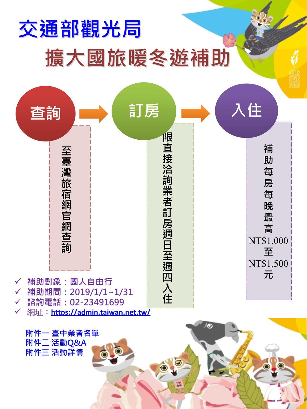- 活動時間:108 年 1 月 1 日起至 108 年 1 月 31 日止。週日至週四入住,才有補助。(1 月 1 日週二可補助,1 月 19 日週六補班日不補助)