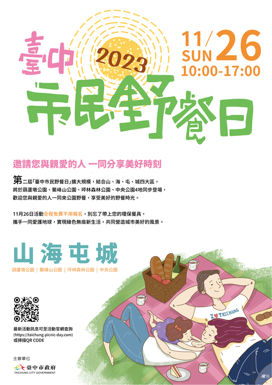 2023臺中市民野餐日,訂於112年11月26日(星期日)於中央公園、葫蘆墩公園、鰲峰山公園、坪林森林公園四地連線開趴,詳細內容請上活動官網查詢。