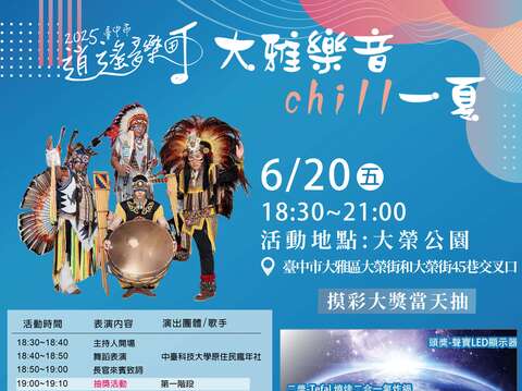 大雅區公所訂於114年6月20日(星期五)下午6時30分至下午9時假臺中大雅區大榮公園(大雅區大榮街和大榮街45巷交叉口)辦理「2025臺中市逍遙音樂町─大雅樂音chill一夏」活動訊息轉知。