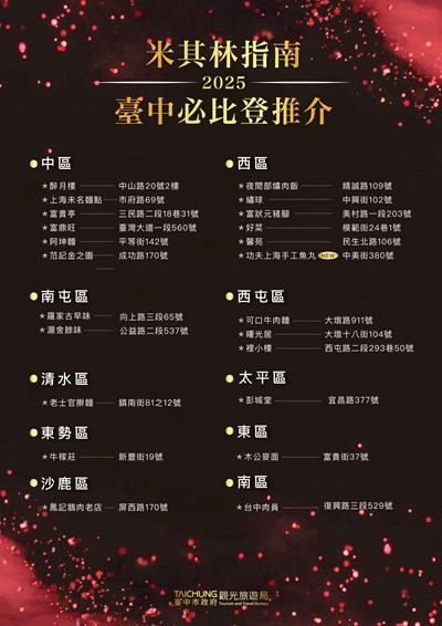 美食界家喻戶曉的《米其林指南2025》於今(12)日公布台灣必比登推介(Bib Gourmand)名單,主打能以親民的價格享用精心美食,台中年度新進榜餐廳有1家,共計有23家必比登推介餐廳飄香國際,其中更有9家已連續6年榮獲必比登推介肯定。台中市政府觀光旅遊局歡迎全國遊客規劃來趟美食之旅,無論想在熱鬧夜市大啖庶民美味,或在優雅餐廳品嚐精緻佳餚,都能找到專屬於您的味蕾驚喜。