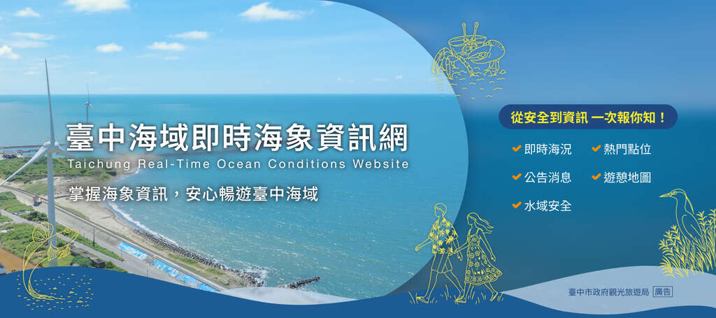 為打造安全無虞的親水環境,台中市政府觀光旅遊局全面更新設置大安濱海樂園、大甲松柏漁港北堤海域等兩大熱門水域活動景點安全警示告示牌,同時正式啟用「台中海域即時海象資訊網」,提醒民眾在進行水域遊憩活動時應注意的事項,有助於提醒遊客迅速了解現場風險資訊、提升自我保護能力,讓遊客都能安心享受台中的海洋魅力。