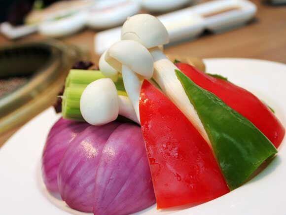 啖燒肉也要有多種蔬菜均衡一下,拼盤內有帶殼的新鮮玉米筍、含水量高的雪白精靈菇、脆甜多汁的洋蔥與甜椒,轉換味蕾的最佳選擇!