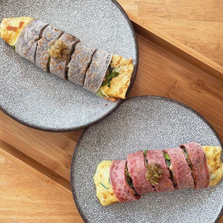 純手工的天然蛋餅,留著食材原先的色澤,才會看到店內的蛋餅皮與市面上的不太一樣,粉紅色餅皮是火龍果製、粉紫色餅皮則是紫薯製,每日的餅皮是隨機的,就看你運氣遇到什麼口味的餅皮囉!蛋餅的餡料包好包滿非常豐富,份量是一般蛋餅的兩倍多,Q彈的餅皮、簡約清新的環境,絕對是你早餐約會的好選擇。