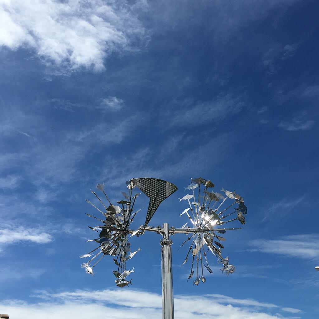 《博浪揚風》以梧棲地區的自然環境元素─風、陽光、海洋為創作主題,營造出自然海天的開闊視野,以及自由愉悅的暢快。