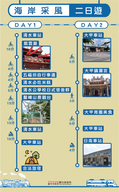 適合對象親子、單車族旅遊天數2日遊旅遊季節春、夏、秋交通工具鐵路、市公車、單車行程類型歷史巡禮、海洋遊趣文章內容定位點台中海線精華全收錄!百年車站、名剎古蹟、經典必吃美食!兩天一夜深入探訪大甲清水雙鎮風情! 繼續閱讀