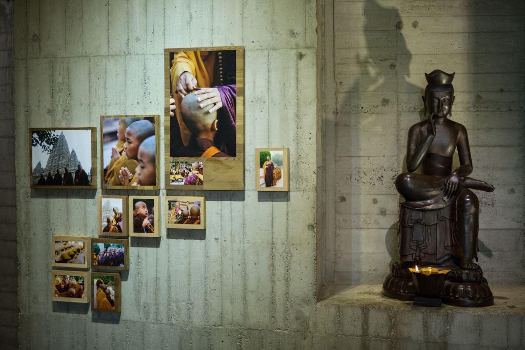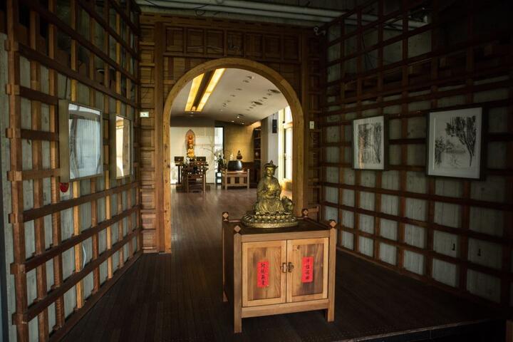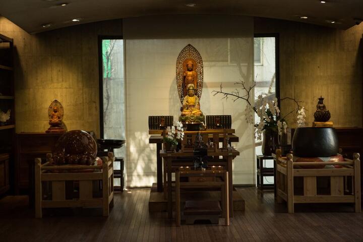 The wall on the 1st floor is decorated with the paintings representing the philosophy held in the Buddha Temple. The 2nd floor is the Buddha Hall, and you will see a simple and elegant Buddha sculpture and the huge window behind it when you walk in. The left side on the 3rd floor is where monks practice Buddhism, and it is not opened to the public. At the right side, there are tables and chairs there. Heart Sutra, pieces of white paper, and pens are placed on the table. It is opened to visitors for “slowing down and carrying out conscious control of breathing” as well as “writing the sutra”. We anticipate people to “write” instead of “copying” because we hope anyone who comes here can be inspired and dedicated except letting go everyday matters temporarily.