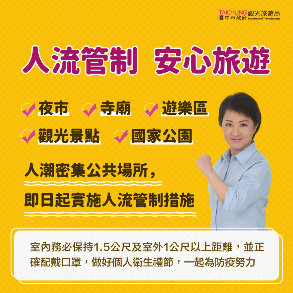 Meanwhile, the staff is requested to promote, control, and management by raising signs and broadcasting at the main entrances during peak hours on holidays. To contain the pandemic, the Taichung City Government actively promotes a safe and comfortable tourism environment and calls for the cooperation of visitors to follow control and management measures.