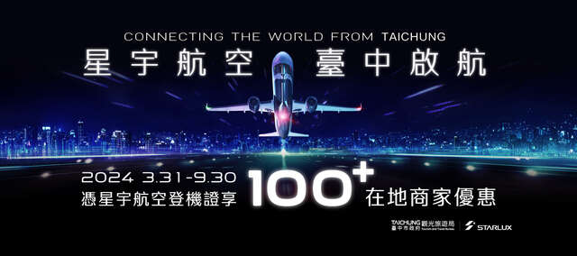 Passengers taking STARLUX Airlines can enjoy discounts at many high-quality souvenir stores in Taichung, along with free DIY experiences at tourist factories and discounts on hotel accommodation. The event runs from now on and ends on September 30, 2024. You're welcome to invite friends to join STARLUX and have fun together in Taichung.