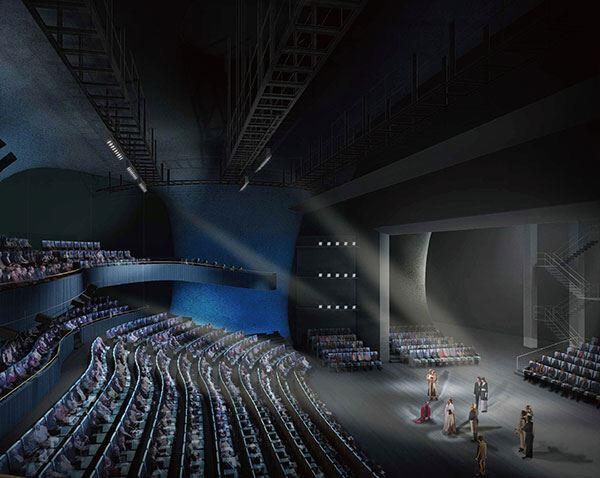 歌劇院の2階にあり、座席数は計796席。建築の流動性、不規則な造型とその奥行きを活かした空間デザインは、観客と舞台の距離を縮め、視界を妨げることなく、緊密に結びついた劇場空間が感じられます。自由なアレンジがきく可変スタイルのホールが、かつてないほどの臨場感を高めてくれます。これこそが中劇場最大の特徴でもあります。プロセニアム形式と呼ばれる額縁型の舞台だけではなく、観客席が周囲を取り囲むスリーサイド・ステージやアリーナステージは、プログラムによって空間を自在に転換することができます。現代的な手法と建築言語の解釈を通して、私たちの暮らしに新しい定義をもたらします。