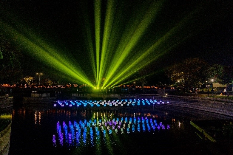 뮤즈 백금상과 DRIVEN x DESIGN 뉴욕 디자인대전 은상을 수상한 드론조명전시인 <생명의 색채>는 50대의 드론으로 연출한 것으로, 펑위엔 후루둔 공원 제5구역의 롼피즈시 수면위에 눈부시게 아름다운 조명세트와 카리스마있는 음악효과, 그리고 서로 다른 색채와 대형변화를 통해 생명의 풍부한 색채를 새롭게 해석한 작품입니다. 각각의 색깔이 인생의 서로 다른 경험을 상징하며, 그 자리에 있는 모든 사람들이 멋진 인생을 살도록 격려하고, 인생의 모든 순간에 색을 입혀줍니다. 중간에 화려한 색깔의 벼이삭 도형을 교차삽입하여 어려운 환경 속에 절대 포기하지 않는 노력을 통해 <풍성한 수확>의 이미지를 표현함으로써, 현장의 모든 사람들에게 펑위엔 과거의 휘황찬란한 추억을 상기시켜주고, 사람의 마음을 흔드는 감동을 전해줍니다.