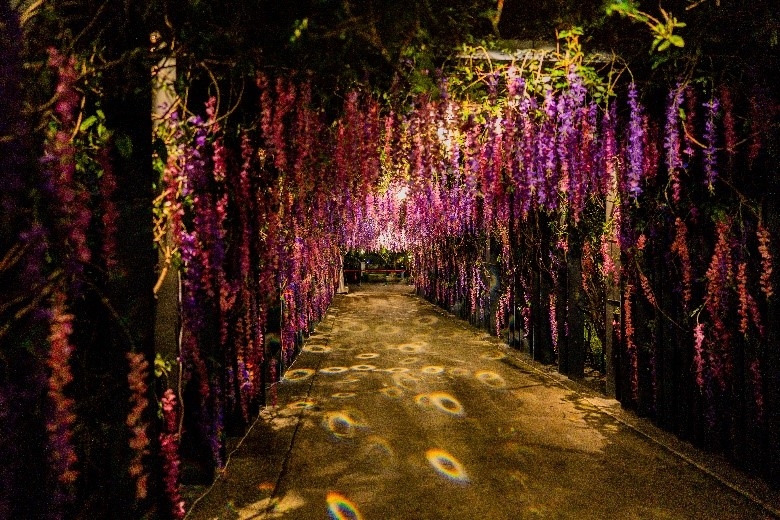 본래는 봄철의 펑위엔에서만 만날 수 있는 꽃이지만, 겨울에도 피어있습니다. 송이 송이 보라빛의 꽃들이 바람을 따라 흔들리고, 보라색 꽃잎이 흩날리는 빗속을 걸어가면 꿈속을 걸어가는 듯한 느낌을 줍니다. 마치 인기있는 애니메이션인 <귀멸의 칼날> 속 등나무꽃 배경같은 모습입니다. 본래는 봄철에 피어나는 꽃이지만, 겨울에도 피어있는 굳은 기세를 느낄 수 있고, 그리움 속에서 사랑을 위해 살아가는 용기도 만들어 볼 수 있습니다.