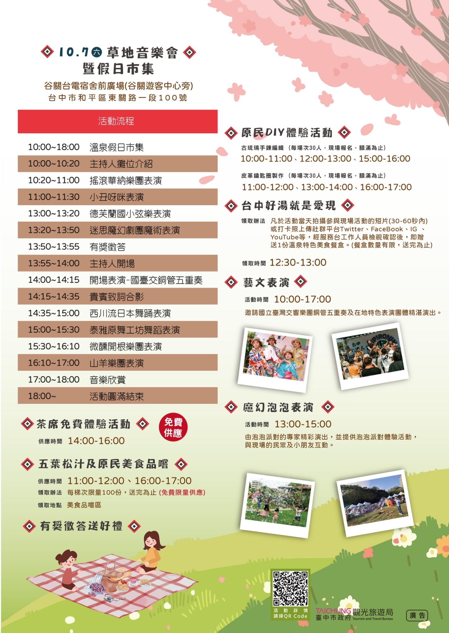 ▶행사 내용:현장에는 휴일장터, 원주민 DIY 체험행사, 국립타이완 교향악단 관현악 5중주등 현지의 독특한 공연, 무료로 제공되는 수량한정 타이완 소나무즙과 원주민 요리등, 풍부하고 재미있는 컨텐츠로 가득합니다. 타이중 하오탕 온천여행은 여러분의 오감을 한번에 만족시켜주고, 몸과 마음에 힐링을 안겨줍니다.