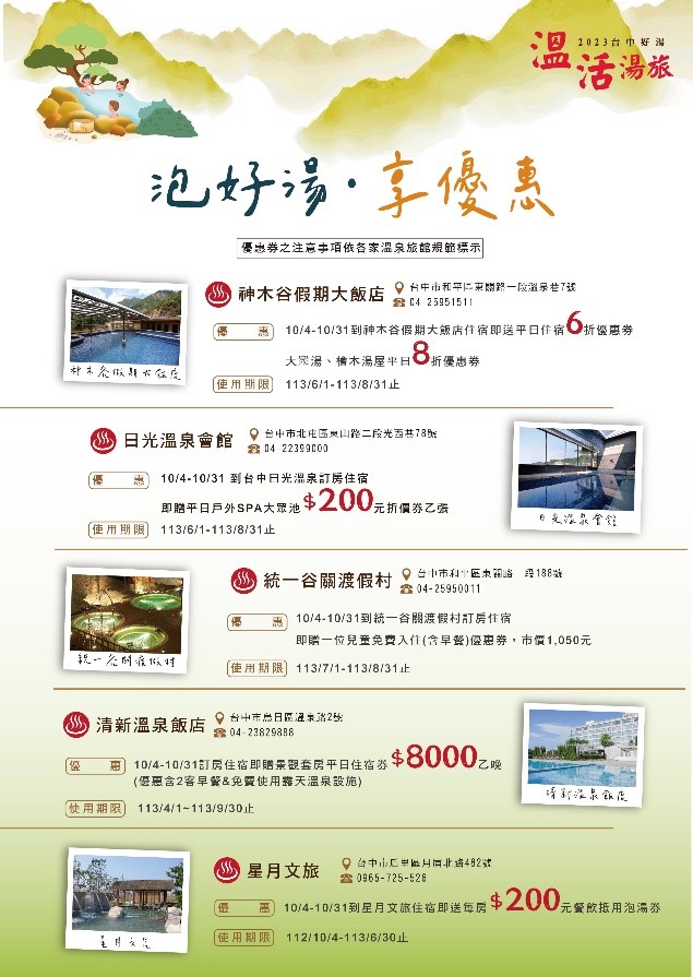 타이중에는 구관, 다컹, 둥스, 우르, 허우리라는 양질의 온천 5곳이 있습니다. 타이중시정부 관광여행국에서는 10/4부터 10/31까지 온천여행 행사를 개최합니다. 10/7에는 구관에서 풀밭음악회 및 휴일장터가 열립니다. 10/4-10/31 기간에 본 행사에 참여하는 온천숙박시설에서 숙박하는 경우, 1박1룸마다 경품추첨권 1장을 받을 수 있고, 일본왕복 비행기티켓+호텔 자유여행 및 타이중 고급 온천호텔 숙박권 추첨에 참여할 수 있습니다. 각 온천 사업체에서는 여러 할인행사를 준비하였습니다. 10/4-10/31 기간동안 본 행사에 참여하는 온천숙박시설에서 숙박하는 모든 여행객들에게 할인권을 제공합니다. 산성도 걷고, 장터도 구경하고, 현지의 음식도 맛보며, 편안한 타이중 일일여행을 떠나보세요.