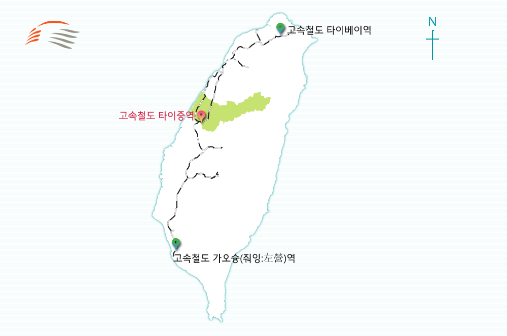 총길이는 345km이며, 타이베이, 반치아오(板橋), 타오위엔(桃園), 신주(新竹), 타이중, 지아이(嘉義), 타이난(台南), 까오숑(줘잉)의 총 8개역이 있습니다. 최고속도는 시속300km이며, 타이완 서부지역을 왕래하는 가장 빠르고 편리한 교통수단입니다.