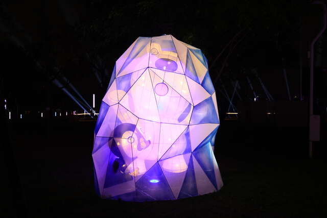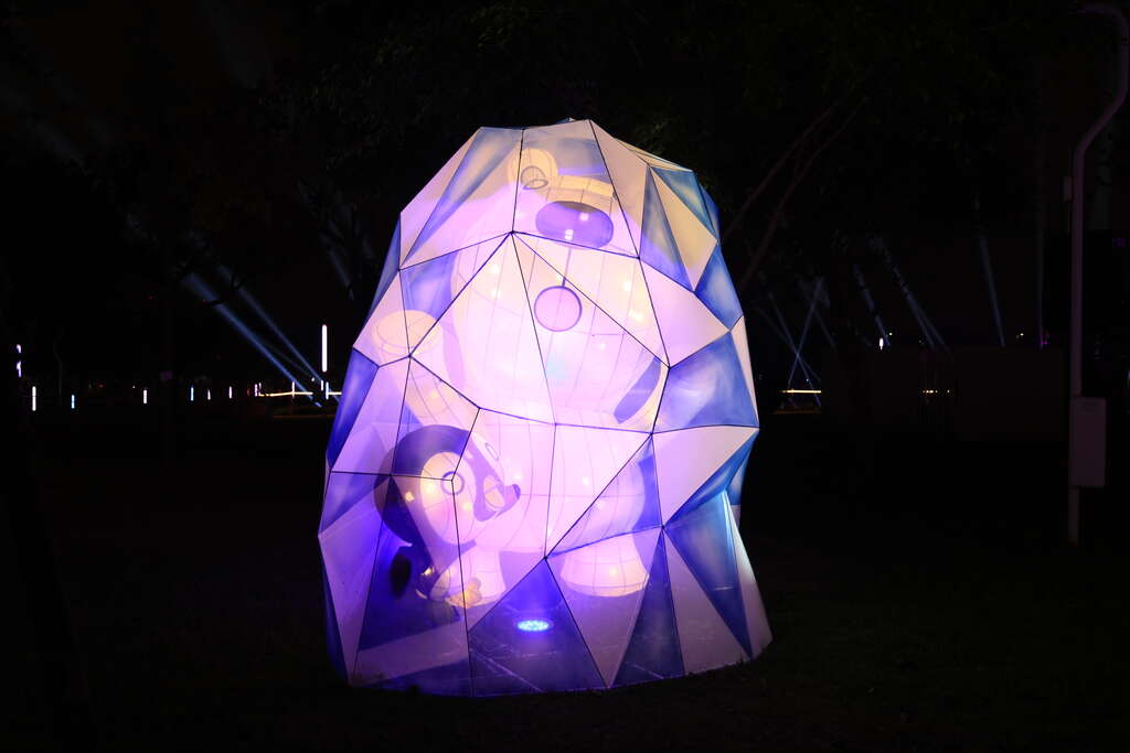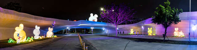 10米高的大型兔子结构装置呈现万花筒般的色彩转换,搭配gobo灯光投射兔子剪影,彷佛兔子群结伴嬉戏,热闹非凡。在大结构兔对面坐着的萌小兔,则以传统花灯手法制作,大兔兔与萌小兔互相对望,也象徵创新与传统的合作。