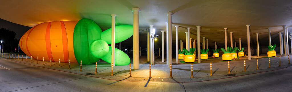 8米高的「兔妈妈」在中央公园跨越桥上方,叼着红萝卜,温暖地守护着天井下的兔宝宝们,天井则变身兔子窝,有好几只可爱兔宝宝在这里或玩或瞌睡的休息着。而另一头的罗马柱变身为大大小小的红萝卜田亩,让兔子窝充满疗癒幸福感。