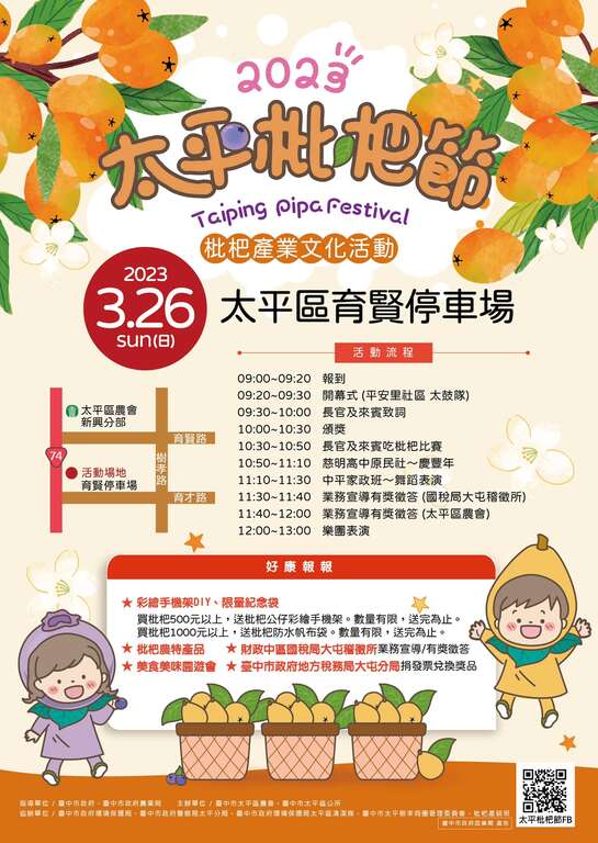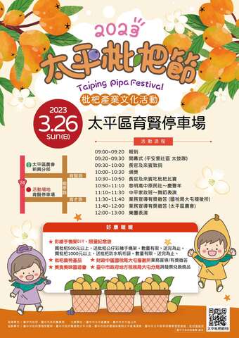 太平区年度盛事「2023太平枇杷节」压轴活动-枇杷产业文化活动,於3/26(日)上午9时假太平区育贤停车场盛大登场!欢迎大家前来品嚐极品枇杷,替太平农友加油赞声。
